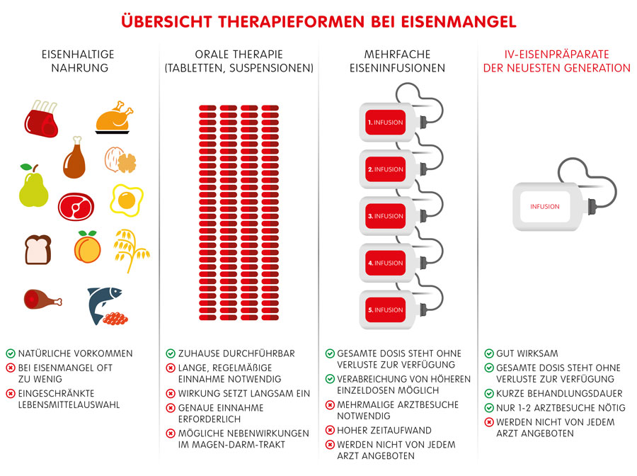 Zum einen gibt es die orale bzw. medikamentöse Therapieform (Tabletten oder Dragees). Bei den intravenösen Therapieformen wird der Eisenspeicher mittels Infusionen aufgefüllt.